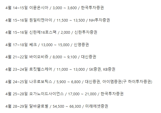 이번 4월에 예정되어있는 공모주 청약일정 우선 알려드리오니 증권사 계좌가 없는 분들은